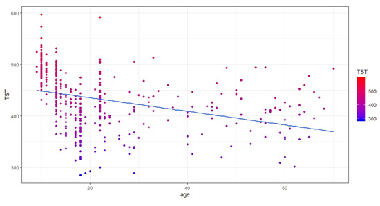 On the contrary, a significant negative relationship was found between age and TST. Results show that, as age increases, the TST parameter significantly decreases (b = −0.273, 95% CI: −0.400; −0.145) (Figure 3). The mean TST found was equal to 431.92 (SD = 57.86).