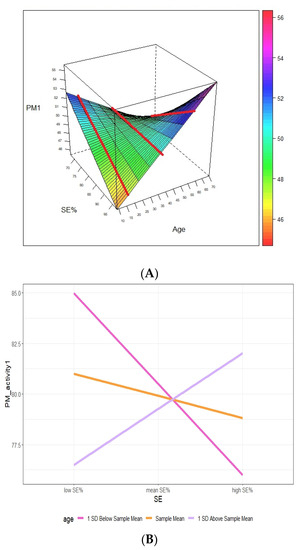 The relationship between SE (%) and PM activity 1 (%) at high, average, and low levels of age. (A) A three-dimensional (3D) graph of the relationship; (B) classical scatterplot of the relationship between variables. When the reference lines (red lines) drawn in Figure 4A are taken into account and rotated clockwise, they overlap, forming the configuration shown in Figure 4B.