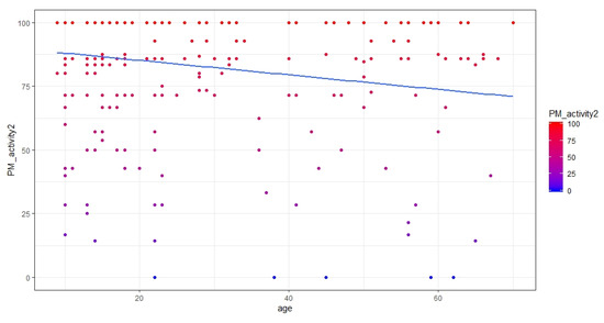 Only age resulted significantly predictive of PM activity 2 (b = −0.146, chi-square = 4.240, p < 0.05). The relationship was negative, pointing out that, with increasing age, performance in activity 2 significantly decreased. Figure 5 shows the relationship between age and PM activity 2.