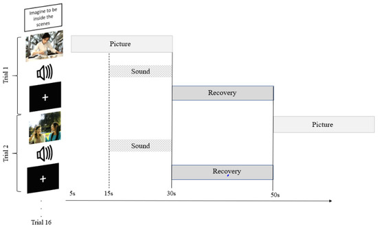 Before the experiment, each participant was randomly assigned to the domestic environment (DE) or outdoor environment (OE) condition first so that conditions were counterbalanced across participants. The instruction “look at the scenes” was displayed at the start of the experiment for both the DE and OE conditions. Each experimental session consisted of 16 trials. For each trial, one image was presented for a total duration of 25 s. The onset of the auditory stimulus occurred after the image had been presented for 10 s, accompanying the last 15 s of the visual stimulus (Figure 2). The offset of both the image and sound was followed by a fixation point, which was displayed at the centre of the blank screen. A recovery period lasted for 20 s before the subsequent trial commenced. The order of the sound stimuli as well as the image-sound pairing in each trial were randomised.