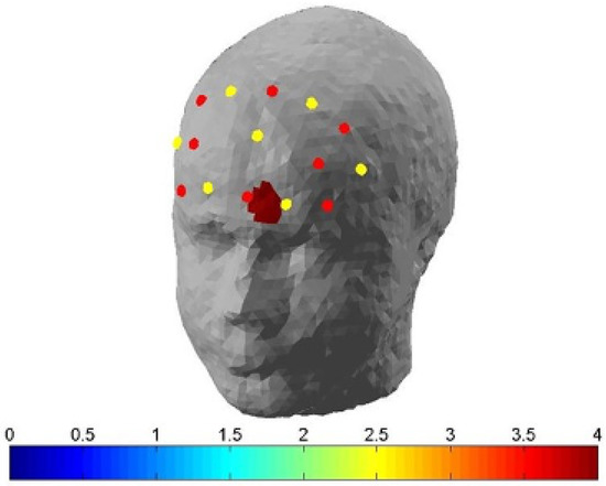 Topographical map of outside of domestic environment (OE) condition–domestic environment (DE) contrast. Topographical map depicting higher OxyHB concentration in channel 11 during response to sounds in the OE, as compared to the DE condition. This channel was located in the left rostrolateral prefrontal cortex.