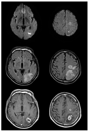 - Lai, P.-H.; Hsu, S.-S.; Ding, S.-W.; Ko, C.-W.; Fu, J.-H.; Weng, M.-J.; Yeh, L.-R.; Wu, M.-T.; Liang, H.-L.; Chen, C.-K.; et al. Proton magnetic resonance spectroscopy and diffusion-weighted imaging in intracranial cystic mass lesions. Surg. Neurol. 2007, 68 (Suppl. 1), S25–S36. [Google Scholar] [CrossRef] [PubMed]