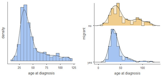 Age at diagnosis distribution histogram and density plot for total sample and split by migrant status.