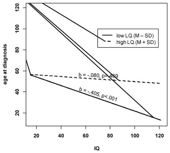 Finally, some further analyses were performed to better understand the negative IQ effect in the multivariate regression model. In detail, we included an interaction term between IQ and LQ, which turned out to be statistically significant (b = 0.007, p < 0.01). In order to interpret this interaction, we plotted the simple slopes, that is, the associations of IQ and age at diagnosis for both high (=M + SD) and low (=M – SD) levels of LQ. Figure 2 shows that there is no association between IQ and age at diagnosis for children with high LQ. This association is negative and significant at low LQ levels. Thus, children with high IQ and low LQ were diagnosed the earliest.
