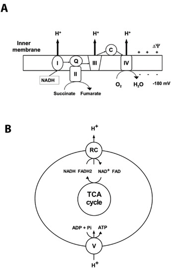 Mitochondrial oxidative phosphorylation. Oxidative phosphorylation generates ATP using the electrochemical potential (comprised of chemical gradient of hydrogen ions and the membrane potential ∆03A8) formed by the respiratory chain complexes in the inner mitochondrial membrane. (A) Complex I (NADH: ubiquinone oxidoreductase (I)) accepts electrons from NADH, and together with complex II (succinate: ubiquinone oxidoreductase (II)), which oxidizes succinate to fumarate, transfers electrons to ubiquinone (Q). Then the electrons are accepted by complex III (III) and transferred to complex IV (IV) via cytochrome C (C). At complex IV oxygen is reduced to water. Respiratory chain (RC) complexes I, III, and IV pump hydrogen ions (H+) across the inner membrane to generate the protomotive force that drives complex V to synthetize ATP. The thin arrows represent the transfer of the electrons; bold arrows show the hydrogen ions’ transport across the inner membrane. (B) Schematic illustration of coupling between activity of respiratory complexes (RC) and ATP production by complex V (ATP synthase).