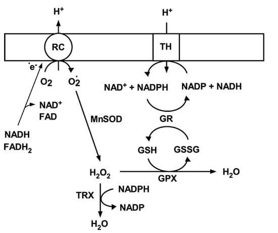 Mitochondrial antioxidant system. Superoxide (O2•-) generated by respiratory chain complexes (RC) is dismutated to hydrogen peroxide (H2O2) by MnSOD. H2O2 is then converted to water either by glutathione peroxidase using reduced glutathione (GSH) or thioredoxin peroxidase (TRX). Oxidized glutathione (GSSG) is then reduced back to GSH by glutathione peroxidase (GPX) using NADPH as an electron donor. NADP is then reduced by transhydrogenase; that is driven by mitochondrial membrane potential and transferring electrons from NADH.