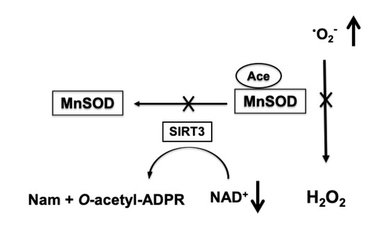 Increased acetylation of mitochondrial proteins has an inhibitory effect on their activity [87]. Since the NAD+ levels are significantly reduced following ischemic insult, mitochondrial proteins show an excessive acetylation during the first 24 h of recovery [56]. Apart from respiratory complexes and TCA cycle enzymes, enzymes of the mitochondrial antioxidative system, particularly MnSOD, are also hyperacetylated [56]. The increased acetylation of MnSOD inhibits the activity of this enzymes [88], and as a result, mitochondrial capacity to detoxify superoxide is compromised and mitochondria become a hot spot for ROS production (Figure 3) [56,86].