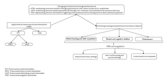 Just as in traditional sports, playing and competing in esports gaming requires fine motor skills, mental agility, and cognitive ability [,]. Therefore, benefits of NIBS observed in the sports literature may have direct implications for esports and can thus serve as a scientific premise for exploring the practical utility of NIBS-based techniques in improving skill acquisition and performance among esports players []. In what follows, we highlight a few areas of research relevant to esports (see Figure 1 for a schematic representation of our proposed framework for potential research), and Table 2 briefly summarizes the studies for the potential benefits of NIBS applications in esports.