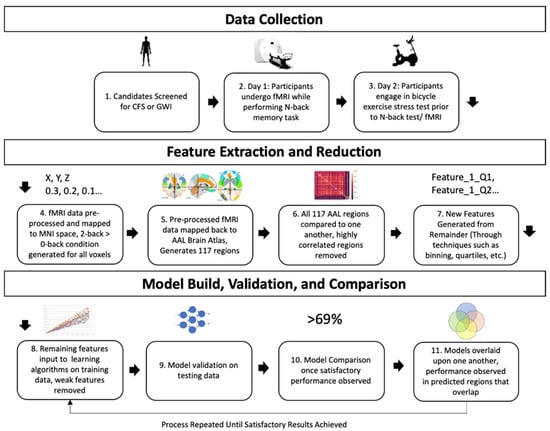 We modeled the fMRI differences previously detected through exertional exhaustion by conducting the continuous version of the n-back working memory test before (Day 1) and after (Day 2) a bicycle exercise stress test. The Blood Oxygenation Level Dependent (BOLD) signals were compared between GWI and CFS subjects on both days. Our approach utilized a standard predictive model build involving feature extraction, feature selection, model selection, validation, and evaluation of performance [27]. SPM12 was used to map activations from each subject to the Automatic Anatomical Labeling (AAL) atlas.