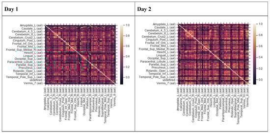 Heat maps depicting Pearson’s correlation coefficients (R) for all Automatic Anatomical Labeling (AAL) regions in Chronic Fatigue Syndrome (CFS) and Gulf War Illness (GWI) datasets for Day 1 and Day 2. The diagonal white line indicates R = 1.