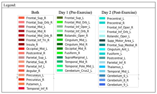 Thirty regions remained in the ensemble model on the first day before exercise and thirty-three regions remained in the ensemble model on the second day after exercise. More AAL regions were involved in the differentiation of CFS from GWI after exercise than before exercise. The qualitative assessment of the activated regions (Figure 2) demonstrated this as well. Interestingly, seventeen regions were shared by the final pre- and post-exercise ensemble models. This was consistent with our prior studies, which had found ten regions shared between the pre- and post-exercise models for CFS [24] and GWI [25]. This suggests there might be some underlying activation patterns that differentiate CFS and GWI whether or not the subject has exertional exhaustion.