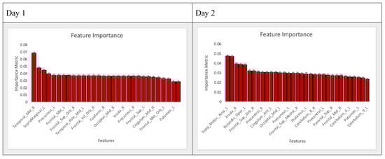 Features were passed through an iterative process of model building and feature reduction based on inclusion and importance metrics. Thirty AAL regions on the first day and thirty-three AAL regions on the second day (Table 2, Figure 3, Figure 4 and Figure 5) were included as the final features for all models. Random Forest Importance metrics and corresponding SVM and Logistic coefficients are reported. All of the features included in the final set were included in each individual model.