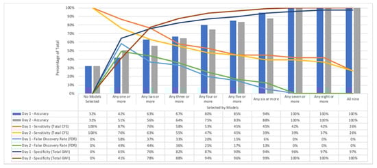 Selections included by all nine models resulted in accuracies of 100% on Day 1 and 100% on Day 2 (Figure 5). However, selections were also included if any seven or more models also had an accuracy of 100% and captured a larger portion of the overall CFS population. In general, segments that were selected by fewer total algorithms and not included in the larger overlap group of models had a much lower accuracy. Although the average accuracy was 75% on Day 1 and 79% on Day 2 across all models, it can be inferred that if a region was selected by only one model it might have been more likely to be a false positive selection.