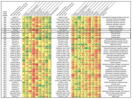Differences between GWI and CFS in Pearson’s correlation coefficients (symptom severity score vs. AAL region) were compared on both days. These differences were also compared to prior known functional associations to AAL regions. Most notably, regions implicated in the “pain cortex” (parietal cortex and insula) had larger differences in correlation coefficients between GWI and CFS [23,24,25]. Many of the remaining regions selected by the model play a role in attention and memory even if the individual difference in correlation was not strong. This is likely explained by the use of these regions for the n-back working memory task.