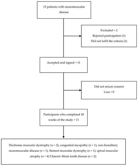 The study participants had to meet the following inclusion criteria: (a) age ≥4 years and ≤18 years (the American Thoracic Society (ATS) advises that the first evaluations be performed around 4–6 years [24]); (b) diagnosis of neuromuscular disease based on molecular genetic analysis, (c) receiving continued treatment with aquatic therapy, for at least three months prior to the start of the study because prescribed techniques need time to produce solid physiological and structural changes; (d) sufficient capacity to understand simple requests and signing of the informed consent by the legal guardians.