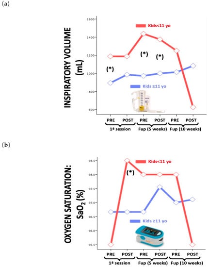 We found significant differences in inspirational volume (p = 0.002) and O2 sat (p = 0.029) for children under the age of 11. (Figure 2a,b)