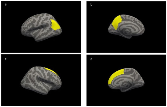 Compared with the control group, the athlete group showed greater cortical thickness in the colored brain regions based on the parcel-wise analysis: (a) indicates the left inferior parietal lobe, (b) indicates the left precuneus, and (c,d) the lateral view of the inferior view of the right superior frontal lobe.