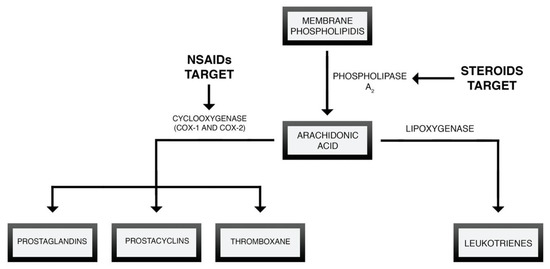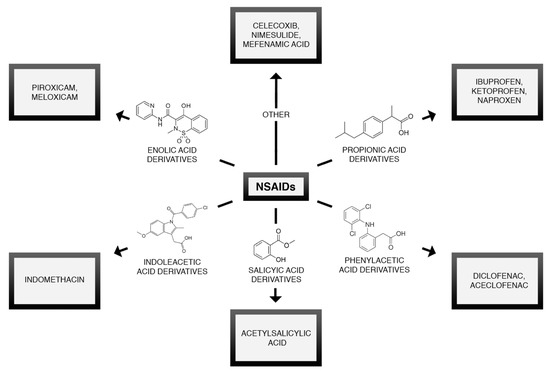 Nonsteroidal Anti-Inflammatory Drugs (NSAIDs) are one of the most widely used drugs worldwide. The popularity of NSAIDs is the result of their easy accessibility and efficacy as anti-inflammatory and analgesic agents. They can be divided based on their chemical structure or ability to selectively inhibit cyclooxygenase isoenzymes [63]. The chemical classification of NSAIDs is presented in Figure 2. NSAIDs influence the arachidonic acid cascade and prostaglandins biosynthesis through the inhibition of cyclooxygenase (COX) [64]—Figure 3.