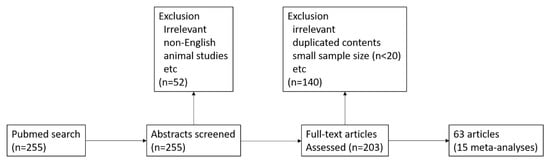 Of the 255 articles identified in the database, 63 were included in this study (Figure 1). The search also found 15 meta-analysis articles referring to α-synuclein, neurofilament light chains, cytokines (interleukin (IL)-1β, IL-6, and transforming growth factor (TGF)-β1), amyloid Aβ42, tau, and phosphorylated tau.
