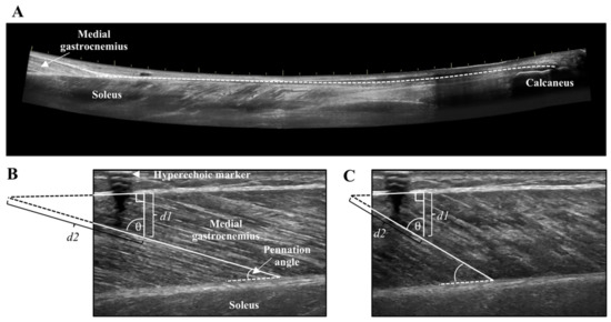 (A) LOGIQView® scan of the Achilles tendon showing the length measurement from the calcaneus to the muscle-tendon junction of the medial gastrocnemius. (B) Resting and (C) contracted medial gastrocnemius fascicle length measurement with extrapolation. Extrapolated portions (d2) were estimated as d1/cosθ.