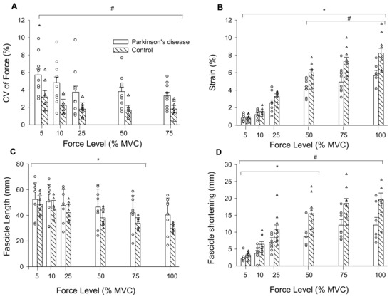 (A) CV of force was greatest at 5% MVC compared to all other force levels, and PD were less steady than controls across all force levels as indicated by their higher CV of force; (B) tendon strain increased across force levels for both groups and was greater in controls than persons with PD from 50% MVC to MVC; (C) Medial gastrocnemius muscle fascicle lengths decreased from 5% MVC to 75% MVC in persons with PD and controls; and (D) fascicle shortening increased from 5% MVC to 50% MVC. CV, coefficient of variation; mm, millimeters; MVC, maximal voluntary contraction. #, PD differs from controls; *, differs from all other force levels (p < 0.05); Values are mean ± SE.