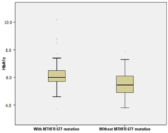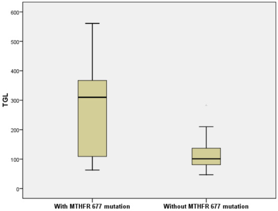 Patients with C677T mutation had a higher risk for increased HbA1c values (OR = 1.982, 95%CI= (1.171, 7.799)). Mann–Whitney U test also revealed that the C677T mutation in the MTHFR gene was associated with significantly higher HbA1c values vs. without mutation (p = 0.004) (Figure 2). TGL values were also significantly higher in the C677T mutation group compared to the group without the mutation (Mann–Whitney U Test, p < 0.001). Patients with C677T polymorphism also had a high risk for hypertriglyceridemia (OR = 1.392, 95%CI = (1.192, 3.994)) (Figure 3).