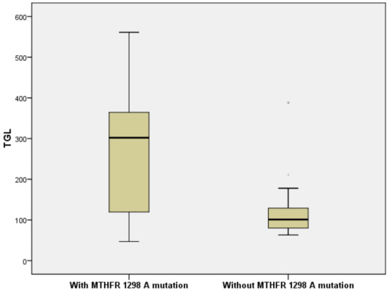 Logistic regression performed using the MTHFR A1298C mutation as a dependent variable (Forward Stepwise (Wald) method) (Table 6) revealed that patients with the A1298C mutation had a risk for developing high TGL values (OR = 2.983, 95%CI = (1.972, 7.994)) (Figure 4). Significantly higher TGL values were found in patients with A1298C mutation compared to the non-mutant group (Mann–Whitney U Test, p < 0.001).