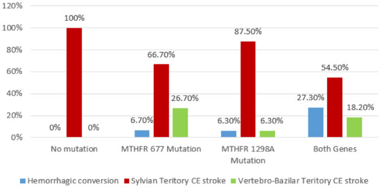 Cardioembolic strokes due to the severity of arterial occlusion by a large thrombus often cause hemorrhagic conversion of an initially ischemic stroke. A systematic review on cardioembolic stroke by Arboix et al. stated that hemorrhagic conversion of CES occurs in approximately 71% of cases. The same authors also found secondary hematomas in a small proportion of patients, respectively 0.8%. Although they do not occur with the same frequency as the hemorrhagic transformation, they are found in patients with NVAF and CES [44]. Several studies tried to identify an association between MTHFR genetic variants and stroke. Kang S et al. performed a meta-analysis in 2013 and found that the C677T mutation was associated with a high risk for hemorrhagic stroke, especially the T allele [45]. Other authors demonstrated that the two genetic MTHFR variants are independent genetic risk factors for stroke, both ischemic and hemorrhagic [46]. A study on an Indian population also indicated the C677T mutation as an important stroke risk factor but failed to make a distinction between ischemic and hemorrhagic stroke [47].