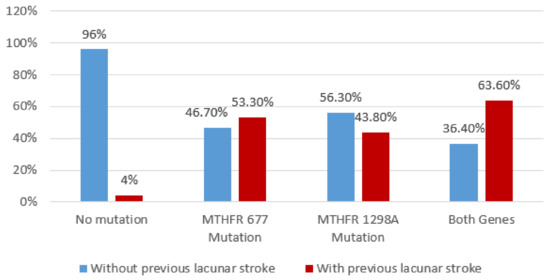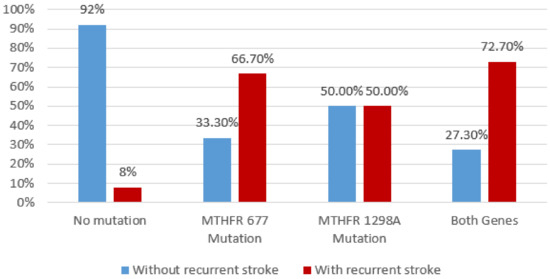 By using multiple comparison analysis, our results showed a significant association between previous lacunar stroke (p = 0.001, Chi2 Test), respectively, recurrent stroke with MTHFR polymorphisms (Chi2 Test, p < 0.001) (Figure 7 and Figure 8).