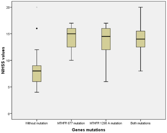 NIHSS scores were significantly lower for patients without MTHFR polymorphisms when compared to patients with one or both genetic variants (Kruskal–Wallis test, p < 0.001) (Figure 9).