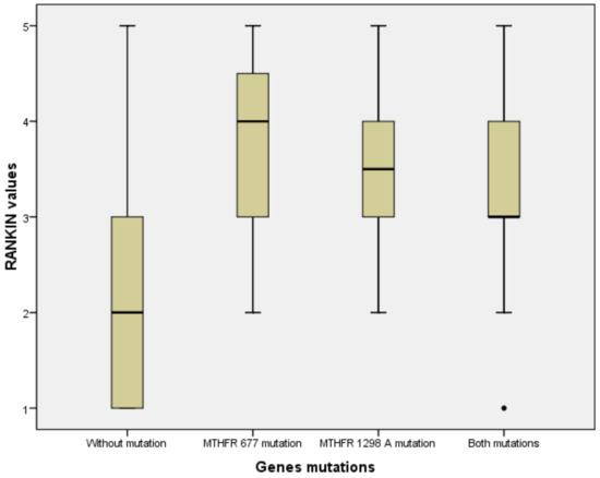 Stroke severity was also analyzed by mRS scores between patients without SNPs of MTHFR, with one (C677T, respectively A1298C) and patients with both SNPs using the Kruskal–Wallis test. The mRS scores were significantly lower for patients without MTHFR polymorphisms (p < 0.001) (Figure 10).