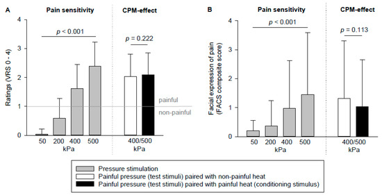 Average pain ratings (A) and the Facial Action Coding System (FACS) composite scores (B) of the different experimental pain stimuli. Subjective and facial responses to these stimuli significantly increased across intensities. No significant conditioned pain modulation (CPM) effect was found, neither when examining pain ratings nor when examining facial responses. CPM, conditioned pain modulation; kPa, kilopascal; FACS, facial action coding system; VRS, verbal rating scale (0 = no pain, 1 = mild pain, 2 = moderate pain, 3 = strong pain, and 4 = very strong pain).