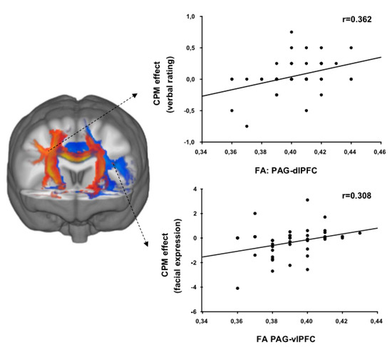 Probabilistic tractography was used to trace the white matter tracts connecting the PAG with the left and right dlPFC and vlPFC as well as the vmPFC. The mean FA from voxels within these tracts was extracted for each participant. Regression analyses including sex as a covariate revealed that pain sensitivity measured via facial expression could be explained by the mean FA within the pathway between the PAG and the vmPFC (R2 = 0.347, p < 0.01, standardized beta coefficient = 0.340). For CPM, both subjective and facial measures could be explained by white matter structure. Mean FA within the pathway between the PAG and the right dlPFC could significantly explain variance in CPM measured via verbal rating (R2 = 0.131, p = 0.016, and standardized beta coefficient = 0.362), while variance in CPM measured via facial expression could be explained by the mean FA between the PAG and left vlPFC (R2 = 0.095, p = 0.042, and standardized beta coefficient = 0.308). For both pathways, increased FA was associated with decreased endogenous pain inhibition. Figure 4 shows the relationship between FA and CPM in scatterplots.
