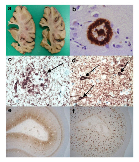 - Alafuzoff, I.; Ince, P.G.; Arzberger, T.; Al-Sarraj, S.; Bell, J.; Bodi, I.; Bogdanovic, N.; Bugiani, O.; Ferrer, I.; Gelpi, E.; et al. Staging/typing of Lewy body related α-synuclein pathology: A study of the BrainNet Europe Consortium. Acta Neuropathol. 2009, 117, 635–652. [Google Scholar] [CrossRef]