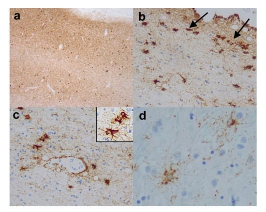 - Kovacs, G.G.; Ferrer, I.; Grinberg, L.T.; Alafuzoff, I.; Attems, J.; Budka, H.; Cairns, N.J.; Crary, J.F.; Duyckaerts, C.; Ghetti, B.; et al. Aging-related tau astrogliopathy (ARTAG): Harmonized evaluation strategy. Acta Neuropathol. 2015, 131, 87–102. [Google Scholar] [CrossRef]