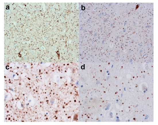 - Irina, A.; Arzberger, T.; Al-Sarraj, S.; Bodi, I.; Bogdanovic, N.; Braak, H.; Bugiani, O.; Del-Tredici, K.; Ferrer, I.; Gelpi, E.; et al. Staging of Neurofibrillary Pathology in Alzheimer’s Disease: A Study of the BrainNet Europe Consortium. Brain Pathol. 2008, 18, 484–496. [Google Scholar] [CrossRef]