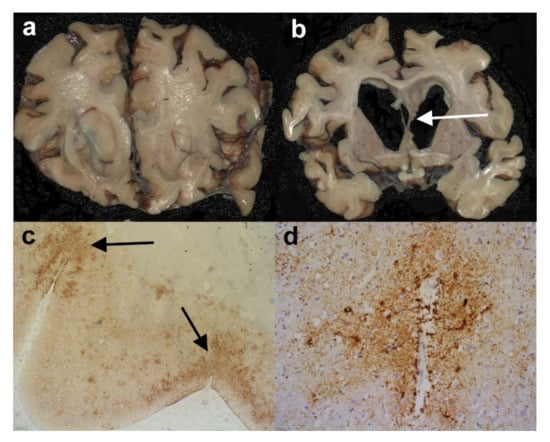 Chronic traumatic encephalopathy (CTE) is a clinicopathological entity which used to be termed dementia pugilistica before it was noted not to be confined to boxers. It has been seen in American and Association football players as well as wrestlers and it is thought to result from repeated concussive or subconcussive blows to the head rather than a solitary severe head injury [21,22,23]. Clinically, it is associated with aggression, irritability, short-term memory problems, depression and suicidal tendencies. There may be cerebral atrophy (Figure 5a,b) and CTE is considered primarily a tauopathy occurring 8–10 years after repetitive head trauma, but it sometimes has additional TDP-43 and or α-synuclein pathology. There are neurofibrillary tangles and astrocytic fibrillary deposits present. The tangles are often irregularly distributed in the cortex and especially superficially, whereas the astrocytic tau pathology is concentrated in subpial and periventricular areas. Tau pathology is also seen at the depths of sulci (Figure 5c) and around vessels (Figure 5d). There can be some confusion and pathological overlap with AD; however, the distribution of tau pathology above is different from AD and there may be little associated Aβ pathology. Furthermore, there is often sparing of the calcarine cortex, unlike the higher stages of AD. Nevertheless, the biochemical composition of the HP-tau is identical to AD; however, recent work has found differences in tangle structure on electron microscopy [24]. Another similarity exists between the pathology of CTE and ARTAG with similar distributions, but ARTAG is considered to be primarily a 4-R tauopathy, whereas CTE has both 3-R and 4-R tau glial inclusions [18]. A staging system of I-IV has been suggested by McKee and colleagues [21].