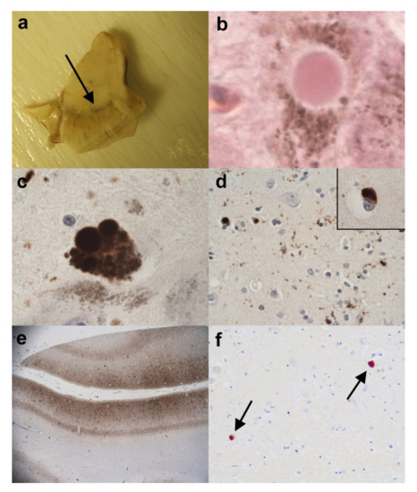 Considering that the association between AD and LB pathology is relatively common, it is extremely important to detect any co-pathology in neuropathological examination as it may explain unusual clinical presentations. Clues to the possible presence of LBs in a case of AD may come in the clinical history with some parkinsonian features or visual hallucinations. Figure 6a–e illustrates a case of AD-modified Braak stage IV (intermediate level of AD neuropathological change according to NIA/AA criteria) and DLB (diffuse neocortical McKeith Lewy body type, Braak Lewy body stage 6). Macroscopically, there may be loss of pigment in the substantia nigra (Figure 6a) in addition to that in the locus coeruleus, which is also commonly seen in AD. LBs (especially in the brainstem) can usually be seen on H&E stains (Figure 6b). Block selection for α-synuclein is important. Medulla and/or pons plus midbrain (including nigra) is essential (Figure 6c), together with “limbic areas” such as cingulate gyrus and amygdala and neocortical areas such as the middle frontal gyrus (Figure 6d) and parietal lobe (Figure 6d inset). This would allow the detection of brainstem, limbic and/or diffuse neocortical LB pathology. An attempt to acquire a Braak and/or McKeith Lewy body stage should be made in addition to the AD stages [26,27]. It may not always be possible since in some cases it may “skip” some of the lower stages, as discussed above with reference to Beach et al.’s staging system [41]. If the LB pathology is confined to the amygdala (Figure 6f), this should be noted. All these features should be included in the report and, in addition to staging the relevant pathologies, there should, if possible, be some attempt at correlating the clinical manifestations with the final pathology.