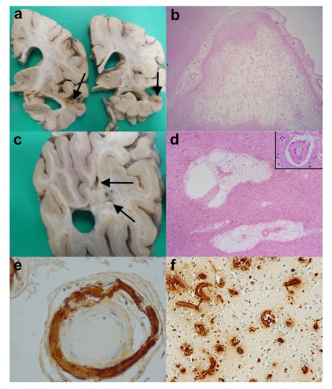 - Thal, D.R.; Ghebremedhin, E.; Rüb, U.; Yamaguchi, H.; Del Tredici, K.; Braak, H. Two types of sporadic cerebral amyloid angiopathy. J. Neuropathol. Exp. Neurol. 2002, 61, 282–293. [Google Scholar] [CrossRef]