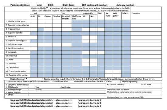 The neuropathology table used by the Brains for Dementia Research (BDR) Brain Bank Consortium to estimate regional pathological severity in individual cases.