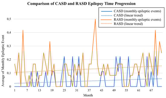 The graph represents oscillations in the presentation of epileptic events in CASD and RASD groups during the 6-year interval. The more frequent and higher spikes suggest a greater occurrence of seizures in the RASD group. Conversely, the seizure-free period reaches the zero level more often and for longer timespans in the CASD group. This trend tends to remain stable across the period of observation.