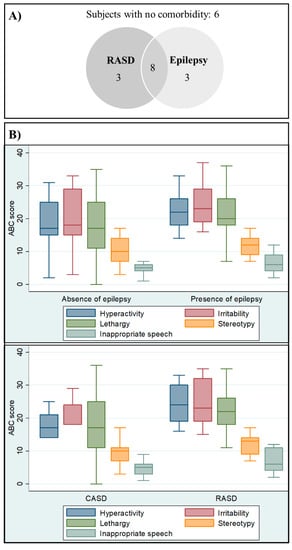(A) Number of subjects with RASD, epilepsy, and both conditions are displayed. (B) Boxplots representing the difference of ABC median scores and the 25th–75th percentile of ABC scores in subjects stratified by epilepsy absent/present and CADS/RASD.