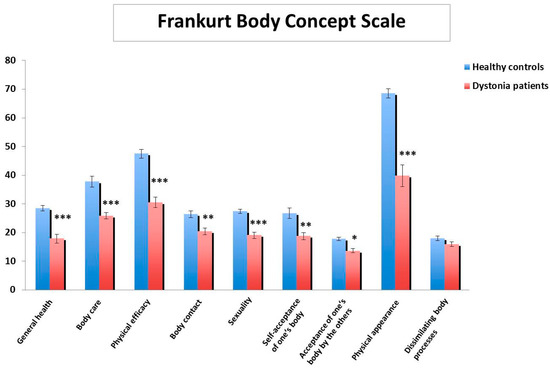 Frankfurt Body Concept Scale subscale scores in patients with dystonia (n = 20) in comparison to healthy controls (n = 25) indicate significant impairment in patients with dystonia in most domains; scores are presented as means ± SEM. * p < 0.05, ** p < 0.01, *** p < 0.001.