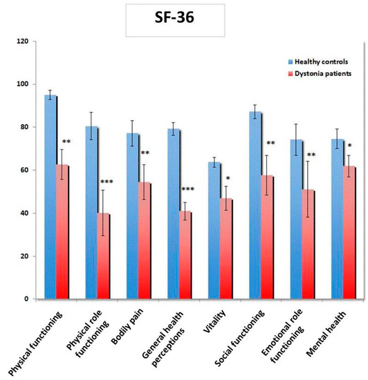 Quality of life (Short Form 36—SF-36) is reduced in patients with dystonia (n = 20) in comparison to healthy controls (n = 25); scores are presented as means ± SEM. * p < 0.05, ** p < 0.01, *** p < 0.001.