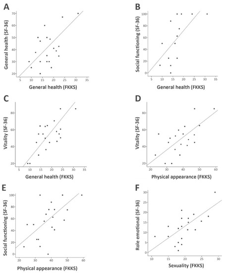 Correlations of SF-36 and FKKS subscales (Pearson correlation, p < 0.05, n = 20). (A) Correlation of self-perception of general health with general health (r2 = 0.41); (B) Correlation of self-perception of general health with social functioning (r2 = 0.42); (C) Correlation of self perception of general health with vitality (r2 = 0.65); (D) Correlation of physical appearance with vitality (r2 = 0.49); (E) Correlation of physical appearance with social functioning (r2 = 0.42); (F) Correlation of sexuality with emotional role functioning (r2 = 0.44).