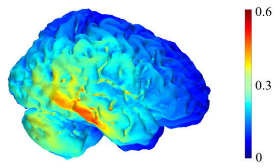 Computational representation of the electric field intensity generated by our transcranial direct current stimulation (tDCS) montage with reference to anode (T8) and an extracephalic cathode. Units are in V/m. The simulation was run using COMETS2 [40].