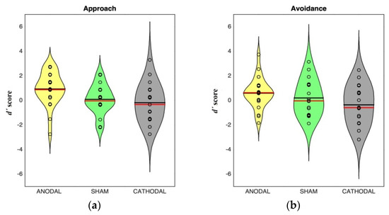 Distribution of discriminability scores in approach (a) and avoidance (b) sentences in the memory task for each stimulation group. Shaded areas represent scores probability density estimated with a kernel density estimator. Dark lines indicate mean, red lines indicate median.