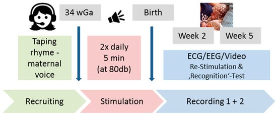 The experimental protocol was divided in a prenatal and postnatal stimulation part (see Figure 1). In preparation for the prenatal stimulation, mothers-to-be visited our laboratory before gestational week 34 and taped the two different nursery rhymes mentioned before. The experimental group (n = 23) received one of the two maternal spoken rhymes (i.e., randomly chosen rhymes of different rhythm) taped on a CD and replayed it over speakers (80 dB) from gestational week 34 on until birth, as we expect 20 dB dampening across the mothers’ belly according to Gerhardt and Abrams [39]. Auditory stimulation took place twice a day (morning and evening) for five minutes (five repetitions of the 60 s lasting nursery rhyme) in the home environment of mother and child. Mothers in the EG were instructed to sit and relax in a quiet room and avoid touching their belly during auditory stimulation. Daily stimulation frequency, stimulation sound pressure level, and mothers’ well-being were verified and documented using a tablet at the mothers’ homes. An additional control group (n = 11) of mothers did not play any rhyme before birth but completed an identical study protocol thereafter.