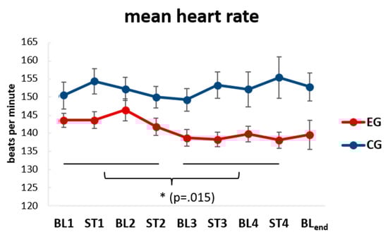 In addition to the analysis of behavioral state shifts in response to the re-exposure with the familiar and unfamiliar auditory stimuli, we complemented the picture with analyses of babies’ physiology, namely heartrate (HR) irrespective of rhyme and voice familiarity. Analysis of HR using a three-way ANOVA with TIME (9 × 3 min periods), AGE (2 weeks, 5 weeks), and GROUP (EG, CG) revealed a main effect for GROUP (F(1, 29) = 8.99, p = 0.006, p.eta2 = 0.24). Post-hoc independent t-tests indicate a lower mean HR in the EG (M = 140.66, SD = 7.81) as compared to the CG (M = 152.56, SD = 10.71) during baseline and stimulation periods. Additionally, comparing the first half (12 min; BL1-ST2) and the second half (12 min; BL3-ST4) of the recordings revealed that the EG, but not the CG, reduced HR (t(20)= 2.67, p = 0.015, d = 0.57) from the first half (M = 143.71, SD = 8.99) to the second half (M = 138.64, SD = 8.83) of the recording (cf. Figure 3). Data, therefore, indicates habituation over the course of the recording exclusively for the prenatally familiarized EG but not the (auditory stimulation-) naïve and unexposed CG. For more details, see Supplemental Table S1.