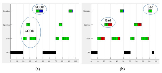 Task Performance: (1) Completion rate (%)—A completion rate is defined as how quickly grasping, opening, and stopping FES operation have been performed, or how long it has lasted during the keep-FES task [88,89]. For example, the completion rate will be 100% if the predetermined MI tasks to be performed succeed in only one attempt (0 s). However, if the target SMR cannot be performed before the maximum analysis time (6 s), the completion rate would be 0%. On the contrary, in the case of performing the keep-SMR task, the SMR must be maintained for 6 s, the maximum analysis time, to achieve 100% completion rate. (2) Accuracy (%)—The successful task implies that the MI tasks were performed without error. However, in the case of semi-asynchronous and asynchronous experiments rather than time-locked and cue-based experiments, the definition of error is not clear. This is because if the operation does not occur because the SMR-related features are not detected during the SMR period, it is a delay rather than an error requiring additional work to be corrected. In addition, due to the nature of the asynchronous experiment, it is difficult to distinguish whether the delay is intended due to a failure to implement MIs. However, from another point of view, it is difficult to define this as a successful task performance if the delay caused by MI induction failure is long enough to affect BCI performance. Therefore, the accuracy in this experiment was defined as follows. (1) If an incorrect decision was made during the SMR period (i.e., no SMR was detecting), then it belongs to a delay until the maximum analysis time (6 s). (2) If an incorrect decision was made during ACT (i.e., the target action was ‘opening’, but classified as ‘grasping’, and vice versa), then it belongs to an error. (3) If an incorrect decision was made during the FES period (i.e., the action should be ‘keep’, but it was classified as ‘stop’, and vice versa), then it belongs to an error. The structure of the classification algorithms utilized in this phase also agree on this argument, because even if it fails to detect the SMR function, it is not necessary to correct this error, but only a delay of 1s occurs. (3) Information Transfer Rate: Many BCI studies have utilized Information Transfer Rate (ITR) to evaluate the performance of BCI systems, which can convey the amount of information per time (bits/minute) in terms of the accuracy and speed [90].